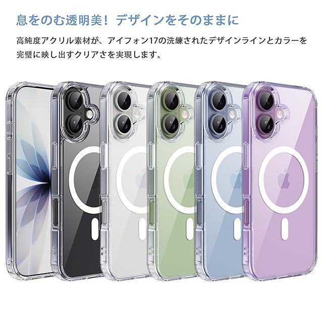 【対応機種】iPhone 17 専用です。精確にカット加工しているので、ボタンが押しやすく、ポートも使いやすくなっており、機能性に影響しません。<br> 【MagSafe対応・超強磁力】1,900 gの吸着力を備えた強力な内蔵磁石により、吸着力を高めて、安定感をアップしてエネ損失なしの快速ワイヤレス充電できる。様々な状況で安定した状態を保ちます。MagSafeバッテリー、MagSafeカードケース、MagSafeワイヤレス充電器、MagSafeリング、車載スタンドなど様々なMagSafeニーズに対応、Magsafeの便利さを満喫しましょう!<br> 【半透明・マットな質感】背面が透ける特性を汲み取ったデザインで、iPhoneのかっこいいリンゴロゴが薄っり見えて、高級感と神秘感が溢れている。背面のポリカーボネートは耐久性や耐摩耗性に優れ、長く使っても綺麗に見え。スマホに近い感覚を味わうことができ。<br> 【高耐衝撃性・カメラ保護】免震構造である高弾力バンパーと耐震構造である丈夫なポリカーボネート背面で組み合わせて、バランスが良く落下衝撃を本体に伝えにくくなる。隆起エッジにより、スマホを置いた時にスクリーンやカメラが擦れにくくなり、傷から保護することができます。<br> 【スリム・軽量】この握りやすいケースは、厚さたった1.2 cmなので、スマホに近い感覚を味わうことができ、ケースをつけたままコネクタへの接続が可能で。<br> 【品質】iPhone ケースを安心してお使いいただくために、当店は製品に関する品質を提供します。製品に不具合がある場合、注文履歴画面より出品者にご連絡いただき、お問い合わせ内容に応じて、交換などの対応が可能です。<br>