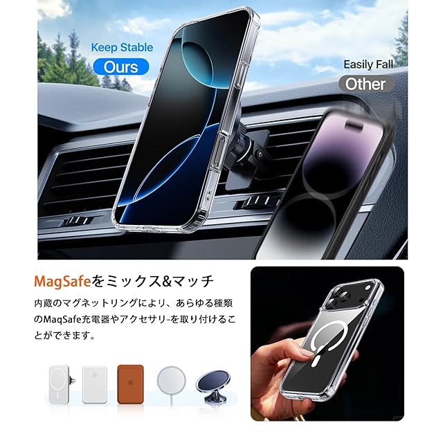 【MagSafe対応・超強磁力】1,900 gの吸着力を備えた強力な内蔵磁石により、吸着力を高めて、安定感をアップしてエネ損失なしの快速ワイヤレス充電できる。様々な状況で安定した状態を保ちます。MagSafeバッテリー、MagSafeカードケース、MagSafeワイヤレス充電器、MagSafeリング、車載スタンドなど様々なMagSafeニーズに対応、Magsafeの便利さを満喫しましょう!