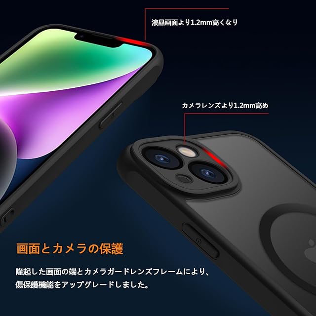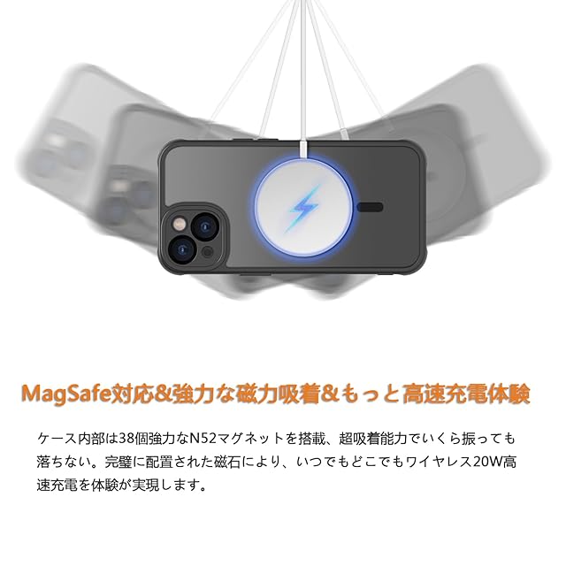 【対応機種】iPhone 専用です。精確にカット加工しているので、ボタンが押しやすく、ポートも使いやすくなっており、機能性に影響しません。<br> 【MagSafe対応・超強磁力】1,900 gの吸着力を備えた強力な内蔵磁石により、吸着力を高めて、安定感をアップしてエネ損失なしの快速ワイヤレス充電できる。様々な状況で安定した状態を保ちます。MagSafeバッテリー、MagSafeカードケース、MagSafeワイヤレス充電器、MagSafeリング、車載スタンドなど様々なMagSafeニーズに対応、Magsafeの便利さを満喫しましょう!<br> 【半透明・マットな質感】背面が透ける特性を汲み取ったデザインで、iPhoneのかっこいいリンゴロゴが薄っり見えて、高級感と神秘感が溢れている。背面のポリカーボネートは耐久性や耐摩耗性に優れ、長く使っても綺麗に見え。スマホに近い感覚を味わうことができ。<br> 【高耐衝撃性・カメラ保護】免震構造である高弾力バンパーと耐震構造である丈夫なポリカーボネート背面で組み合わせて、バランスが良く落下衝撃を本体に伝えにくくなる。隆起エッジにより、スマホを置いた時にスクリーンやカメラが擦れにくくなり、傷から保護することができます。<br> 【スリム・軽量】この握りやすいケースは、厚さたった1.2 cmなので、スマホに近い感覚を味わうことができ、ケースをつけたままコネクタへの接続が可能で。<br> 【品質】iPhone ケースを安心してお使いいただくために、当店は製品に関する品質を提供します。製品に不具合がある場合、注文履歴画面より出品者にご連絡いただき、お問い合わせ内容に応じて、交換などの対応が可能です。<br>