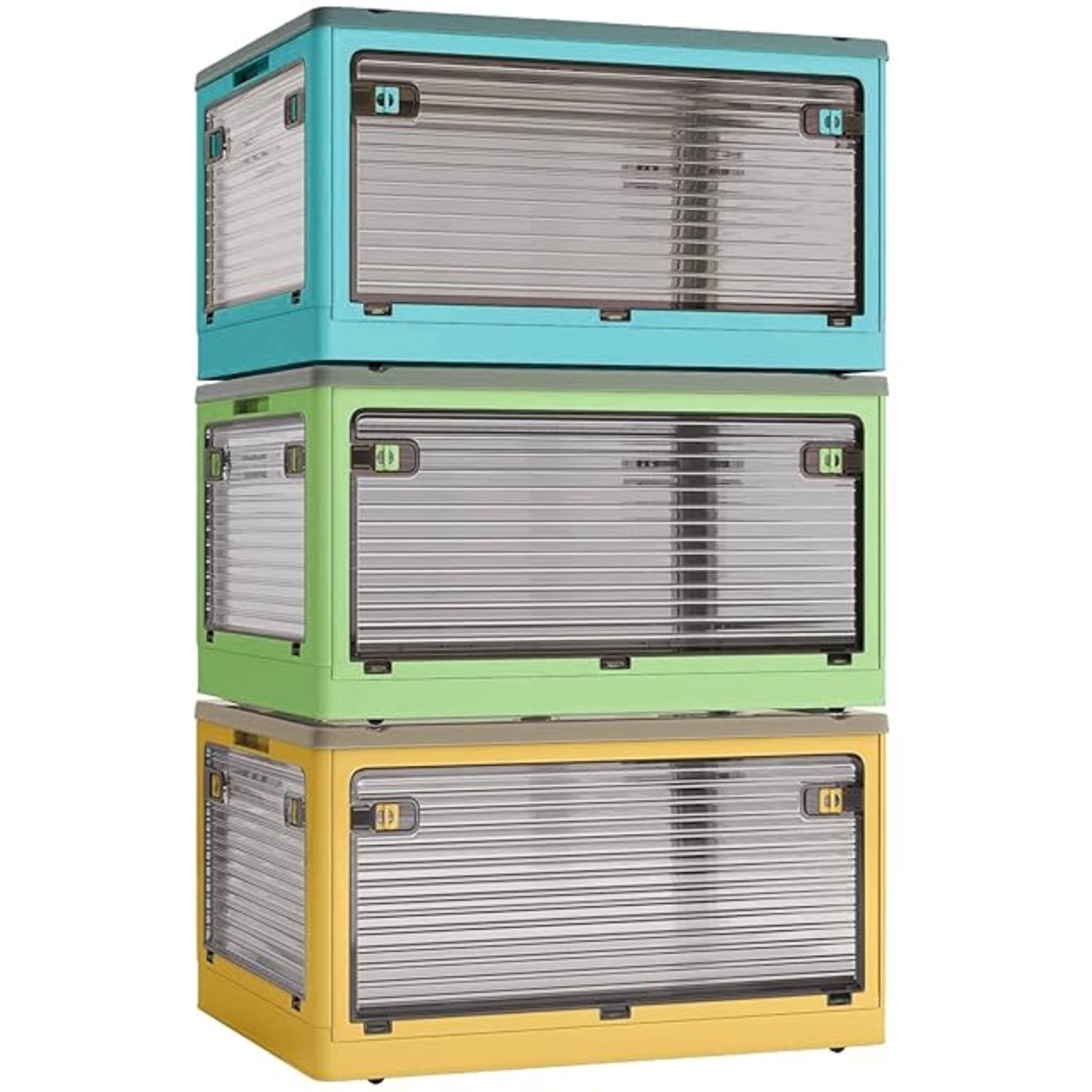 【折り畳み▪上に蓋/側面扉付き】収納箱界の大革新!使わない時に折りたたんで収納できます。スペースを取りません。側面四面も扉付き、収納にとても便利です。上にふた付き、物を入れやすい。蓋をロックできます。物を取るは側面扉から、ボックスを積み重ねる状態にも楽に物を取り出して、伝統的な収納ボックスに比べてもっと便利で、機能性が向上します。