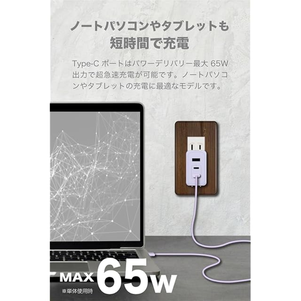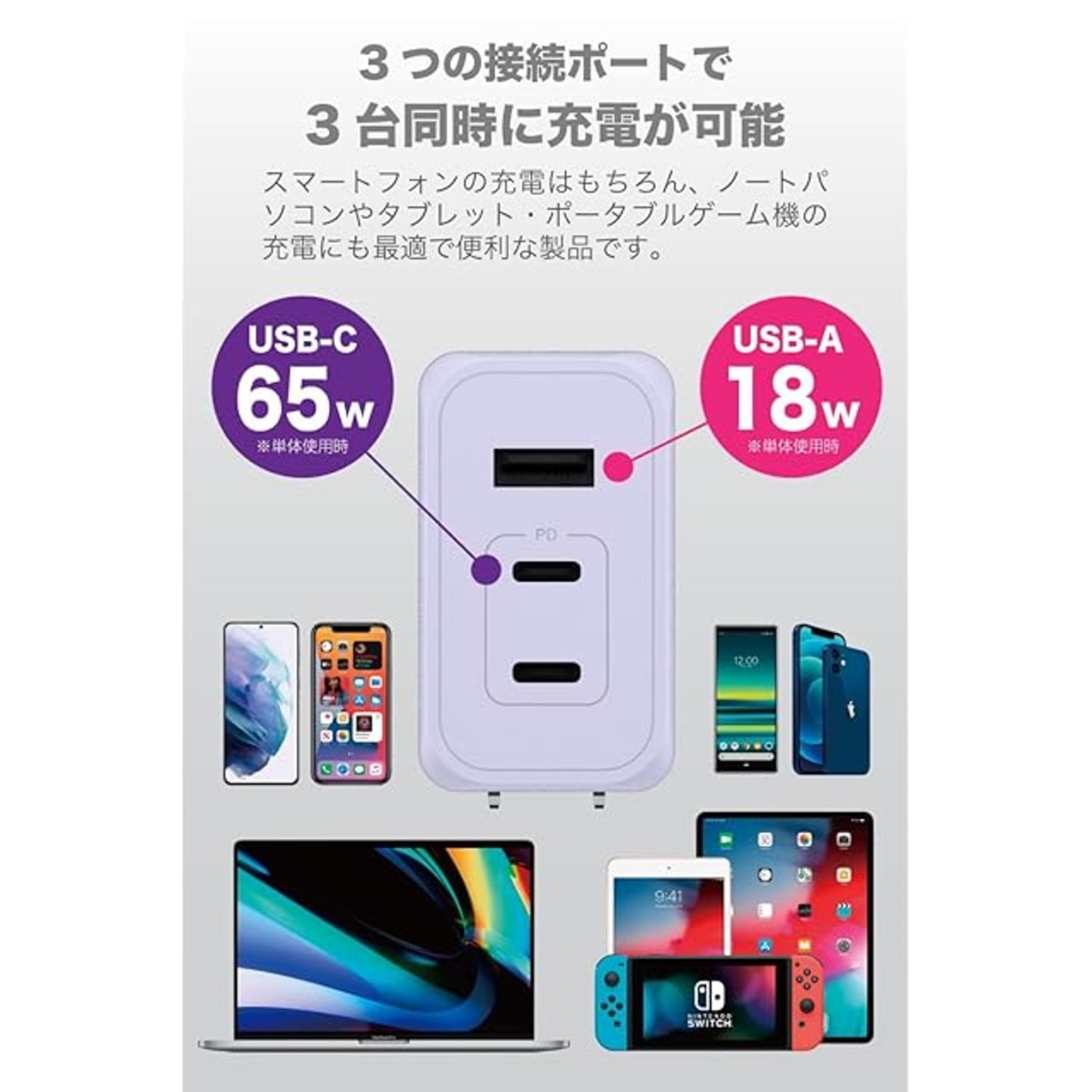 商品名:多摩電子工業 PD65W対応 AC充電器 USB x3ポート(USB-C x2、USB-A x1)Permier PR-AP146UC2V GaN採用 急速充電 ACアダプター 新型GaN 窒化ガリウム採用 PSE技術基準適合 折りたたみ式プラグ iPhone15/ 16 / 17 /17 Pro/17 Pro Max/iPhone Air/Android/MacBook (ラベンダー)