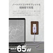 超急速充電が可能なPD(USBパワーデリバリー)に対応したコンセント充電器。新素材GaN(窒化ガリウム)を半導体(集積回路)に採用。従来のシリコン半導体に比べ低発熱と小型化を実現。最大出力65W給電でノートパソコン、スマホやタブレット、ゲーム機の充電に最適。Type-Cポート×2とUSB-Aポート×1を搭載。過電流・過電圧保護機能を搭載した安全設計。90°回転式プラグACプラグ採用で収納、持運びに便利。海外でも使用できるAC100V/240V対応。※国や地域によって市販の変換プラグが必要になる場合があります。※本製品に充電用ケーブルは付属されていません。 主な本体仕様 : ●入力:AC100V~240V 50/60Hz 1.5A max ●USBポート仕様 USB-C x 2ポート(PD65W対応)、USB-A x 1ポート ①USB-C1:PD65W(5V/3A,9V/3A,12V/3A,15V/3A,20V/3.25A) ②USB-C2:PD65W(5V/3A,9V/3A,12V/3A,15V/3A,20V/3.25A) ③USB-A1:18W(5V/3A,9V/2A,12V/1.5A) ④USB-C1+C2:PD45W+PD20W ⑤USB-C1+A1:PD45W+18W ⑥USB-C2+A1:15W(5V/3A) ⑦USB-C1+(C2+A1):PD45W+15W(5V/3A)※3ポート同時使用時合計最大60W ●サイズ:約W32×H54×D52mm(ACプラグを含まず)●質量:約123g ●材質:本体ケース PC、ACプラグ 銅合金 ●:1年