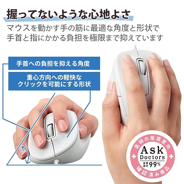 整形外科医との共同開発により自然な手の形のまま使える、握らないマウス“EX-G"シリーズ。手首と指を動かす筋に着目し、マウスを動かす際にかかる身体の負担を極限まで抑えた有線5ボタンマウスです。