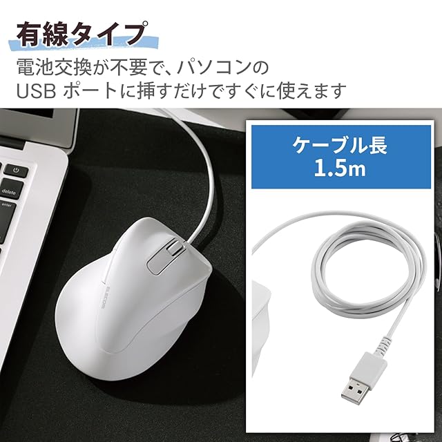 電池交換が不要で、パソコンのUSBポートにケーブルを差すだけですぐに使える有線接続タイプです。