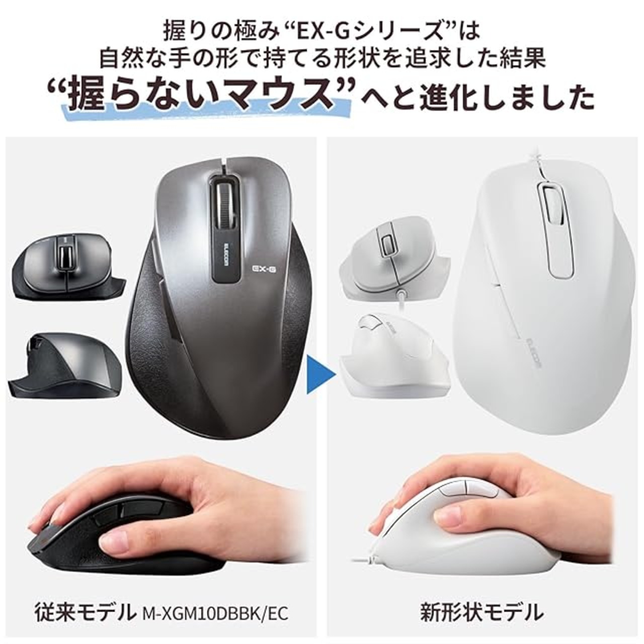 医師との共同開発により究極の握り心地を実現した5ボタンマウス“EX-G"。