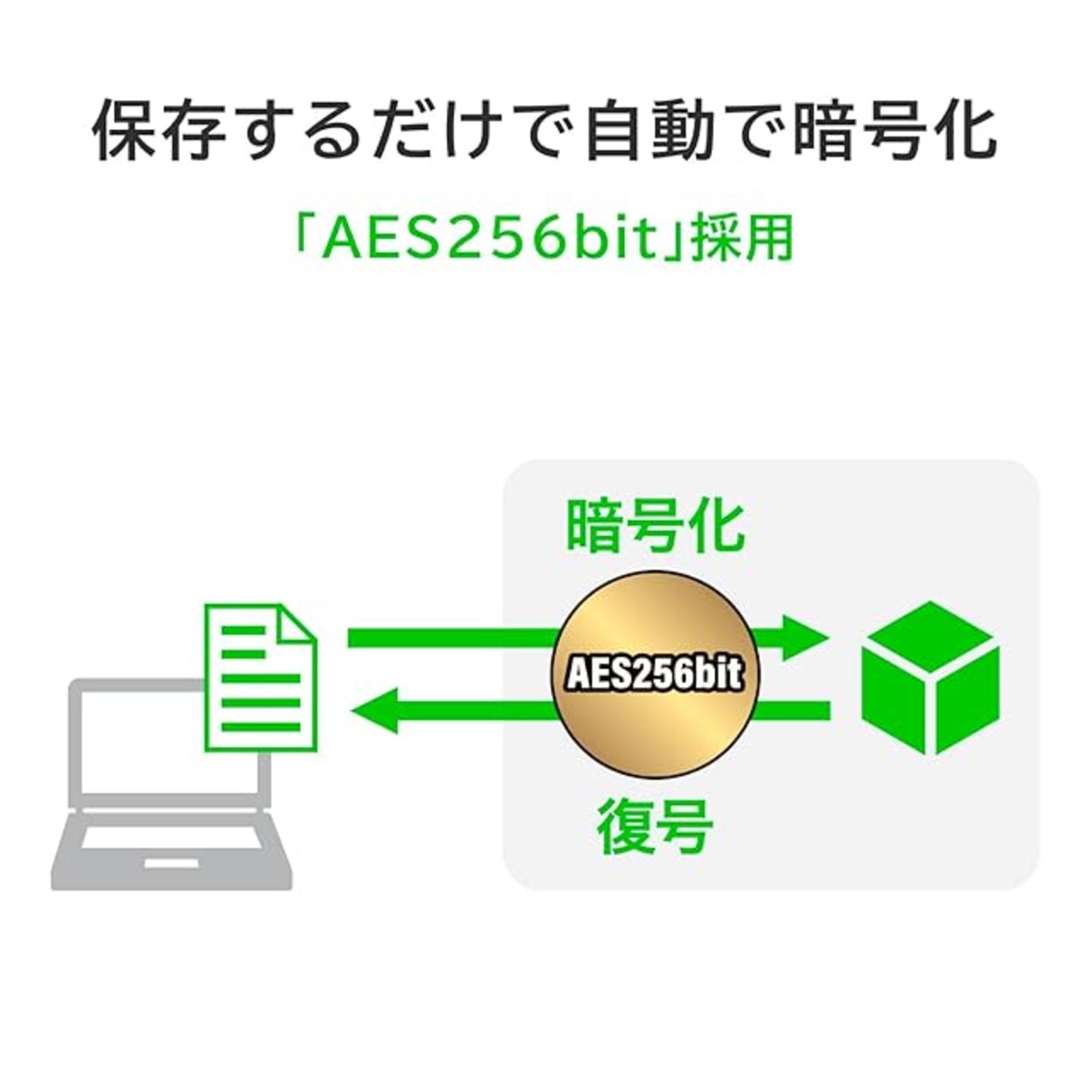 【[Wの安心]I 情報漏洩を防ぐ安心設計】保存するデータは、すべて自動で暗号化され、簡単に情報漏洩対策ができます。保存したデータにアクセスするためには、パスワードによる認証が必要となります。「ハードウェア自動暗号化」「パスワードロック」「ケンジントンスロット」で大切なデータを強力に守ります。