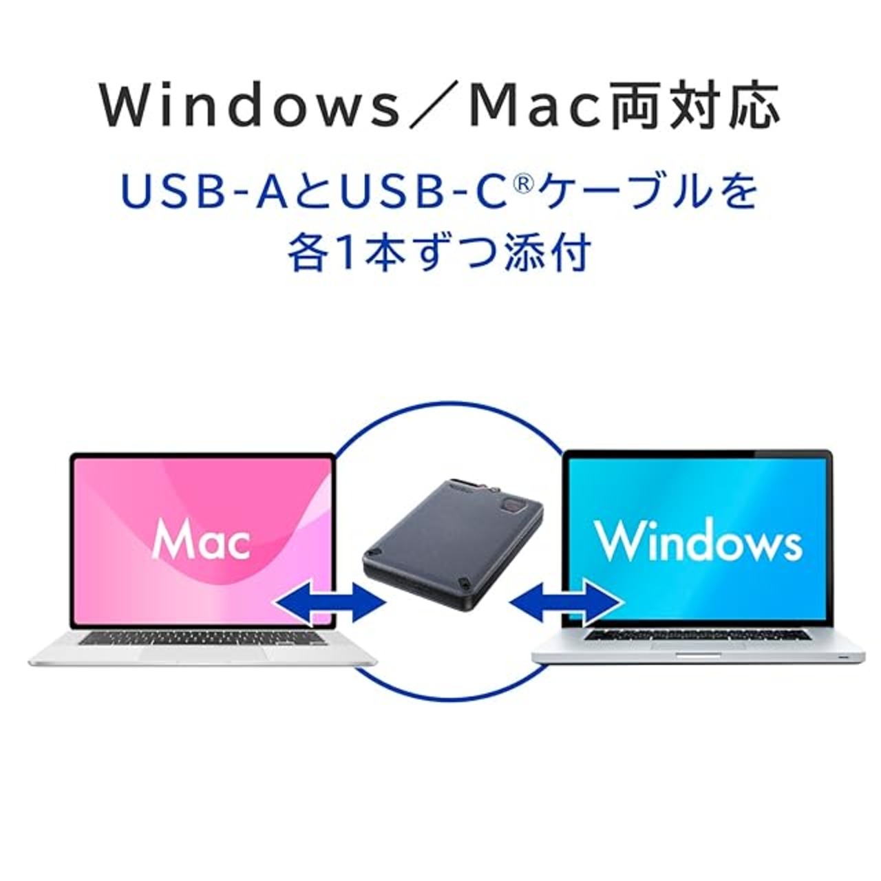 【Windows/Mac両対応!USB-C(R)ケーブルも添付】Windows/Mac両方に対応しています。USB-AケーブルとUSB-Cケーブルを各1本ずつ搭載しておりますので、幅広い機種でお使いいただけます。Windowsの場合、管理者権限だけでなく、ユーザー権限でご利用いただくことが可能です。※初期化する際は、管理者権限が必要です。
