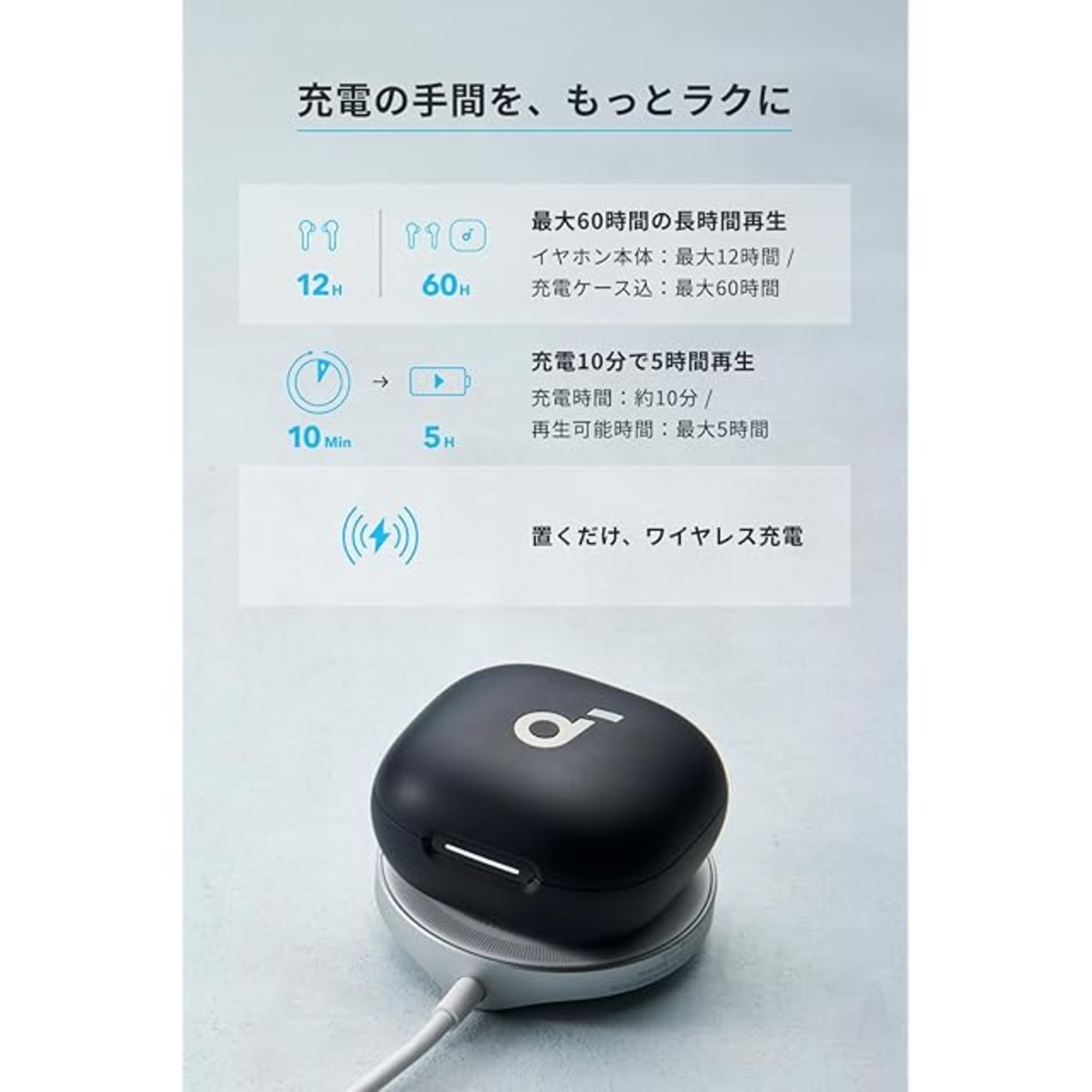 最大60時間の長時間再生:イヤホン本体が満充電の状態で最大12時間、充電ケースを合わせて使うと、最大60時間の音楽再生が可能。また10分間の充電で約5時間分の再生が可能な短時間充電にも対応しました。