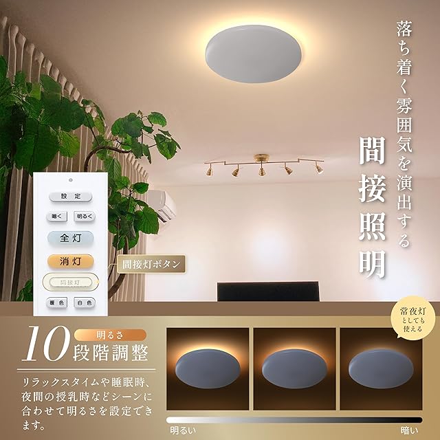 【利用シーンに合わせた明るさ・光色を】利用シーンやその日の天気によって10段階で選べる調光・調色機能、さらに天井をやわらかく照らす間接灯も搭載しております。間接灯の最小の明るさ常夜灯としてご使用いただけます。また、2パターンの点灯状態を記憶できるメモリ機能がついているので、ワンタッチでお好みの明るさに点灯できます。