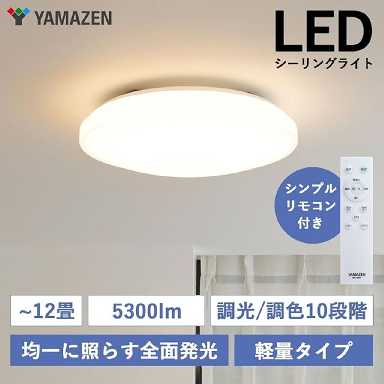 商品名:[山善] LEDシーリングライト 12畳 (日本照明工業会基準) 5300lm 室内/天井照明 10段階調光/調色タイプ 常夜灯 リモコン付き 和室 リビング 寝室 メモリ機能 OFFタイマー (30分/60分) LC-G12V