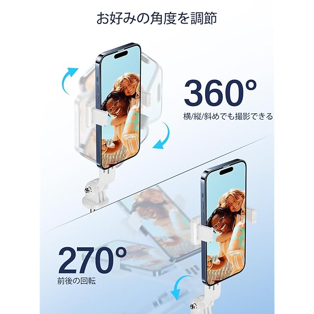 【360°+260°全方位自由調節】自 撮り 棒のクランプは従来型にある水平360°回転を受け継いだ以外、より一層改良できたところは上下260°回転実現、撮影角度を気にする必要はありません。横幅4~7インチのスマホをじどり棒のホルダーに装着するのが可能、小さい端末でも、大画面の端末でもしっかり固定できます!