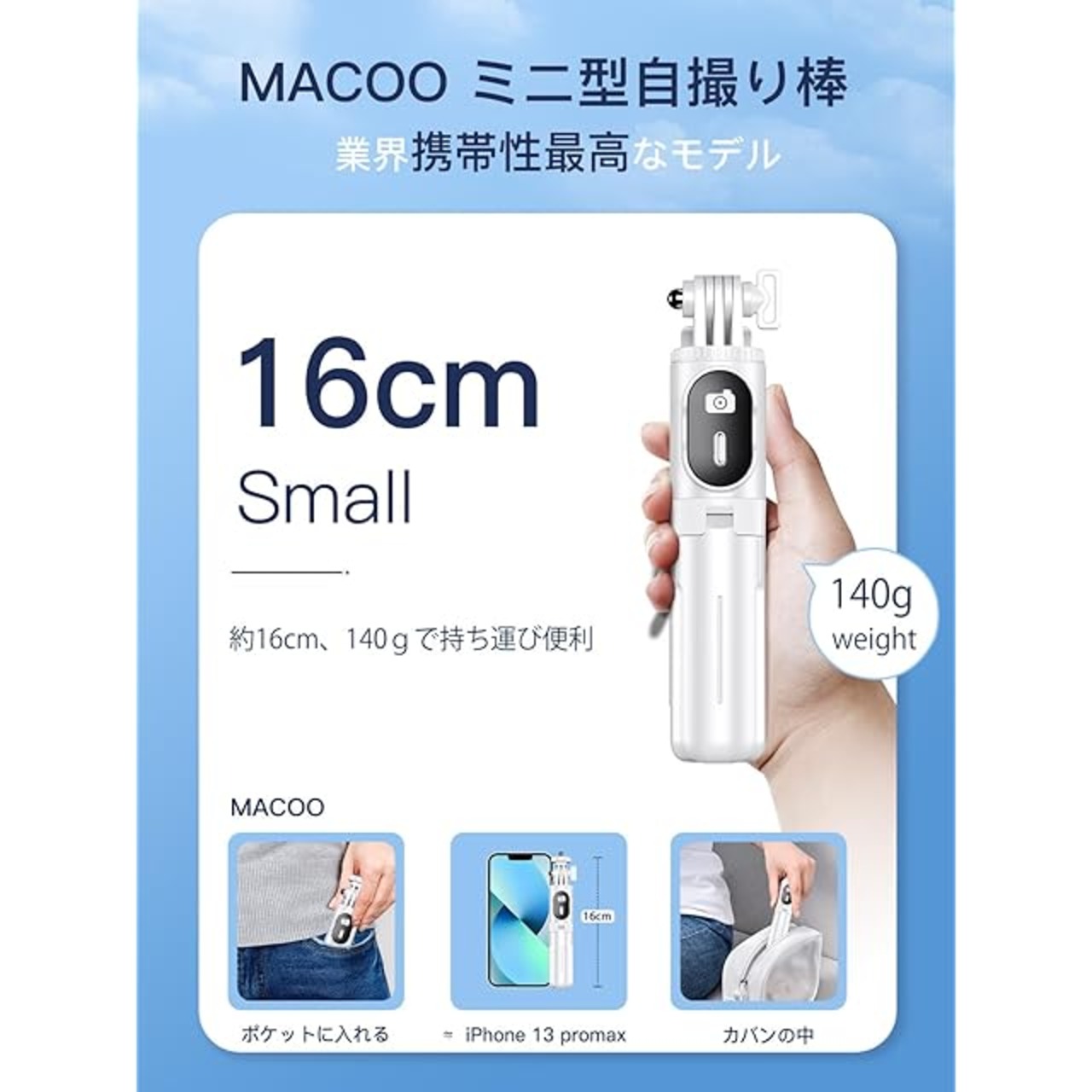 【軽量、ポケットサイズ】MACOOは自撮り棒を使用するシーンを考えて、数え切れないほどの実験の経て、自撮り棒の機能が満たされている状態で更に小型に進化しました。自撮り棒は71cmまで伸縮可能、折り畳んだ状態は16㎝、500mlのペットボトルよりも小さい、薄さは半分ぐらい、ズボンのケットにも入ります。じどり棒の重量は約140g、市販商品と比べると35%軽量化して、持ち運びは非常に便利です!