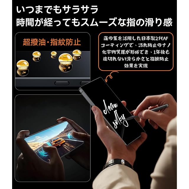【指紋防止・指滑り超快適】Galaxy S25 Ultra用保護フィルムは蓮の葉バイオテクノロジーを活用した日本製2代AF(Anti-Fingerprint)コーティングを利用して、汚れ防止のナノ化学物質層が形成でき、1年後も途切れない滑らかさと指紋防止効果を実現。時間に左右されず、滑らかな指滑り。