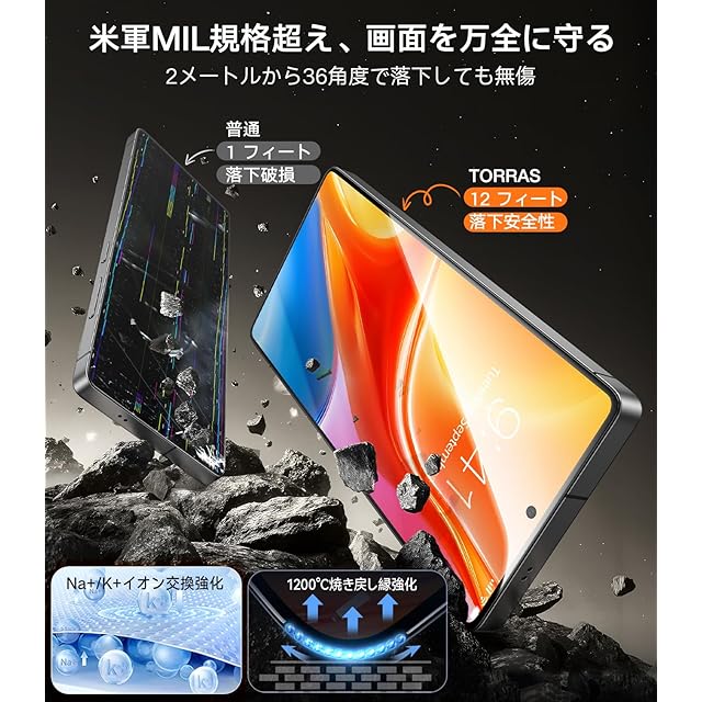 【米軍MIL規格越え・隅々まで全面保護】Galaxy S25 Ultra用フィルムに組み込まれたNa+/K+イオン交換、SCL緩衝層などの30つ以上の革命的な加工技術で、表面に圧縮応力層を発生させ、耐衝撃性が20倍に上がった。1200℃焼き戻し二次強化技術で作られた縁は端をしっかりと守り、2m落下実測(各方向で合計36回)で、どんな角度から落ちてもフチ割れの心配はご無用。※米軍「MIL-STD-810G」規格認証番号:GZMR220300626209|認証機関:CSTC Standards Testing Center|Mar 28, 2022