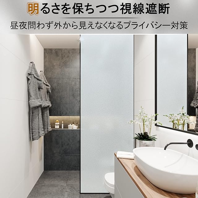 プライバシー対策:20cm以上離れていれば、天気や昼夜を問わず、室内を見えにくくする窓ガラス目隠しシート。欧米輸入高品質材料を使用する、変色しにくく耐久性が高い窓フィルムです。仕事や遊びが安心できます。 オフィス、会議室、浴室など目隠し効果が大事なところにおすすめします。