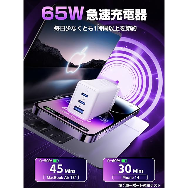 【一歩先行く、急速充電器】朝のお出かけ前や緊急時に電池切れに?そんな時、弊社の65w usb-c 充電器が最適に機能するようになります。短時間でデバイスを急速充電できる!高速充電器は最大出力65Wで、MacBook Airを約2時間、MacBook Proを約1.5時間と短時間でフル充電できます。また、この65w 充電器は、従来の充電器 type-cより6倍ぐらいスピードアップさせました。わずか30分でiPhone14が0~60%まで充電できます。フル充電時間は40分以上短縮され、毎日少なくとも1時間以上の時間を節約できます。「いつでもフル充電」!