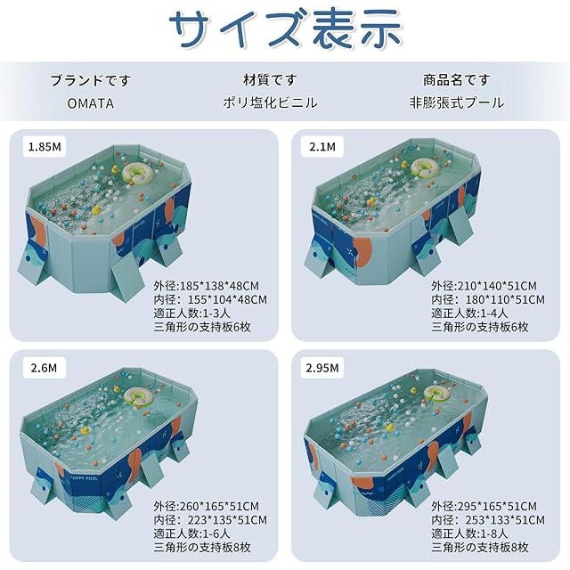 【新昇級 非膨張式プール】スイミングプールのサイズは1.85M、2.1M、2.6M、2.95Mがあり、ご自宅のフリースペースの位置に合わせて適切なサイズをお選びいただけます。プールの外径は295*165*51cm、内径は253*133*51cm、1〜10人を収容でき。大人が伸び伸びと遊べる広々とした深さです。親子で遊び、親子関係を深め、充実した夏休みを過ごすことができます。
