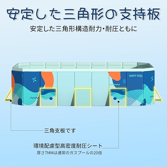 【水漏れ防止・安定した三角構造】厚さ7mmの高強度4層コンポジットでを使用し、底面には3mmの高品質PVC素材を使用しているので、耐摩耗性と耐パンク性、水漏れを防ぎ、従来のインフレータブルプールに比べて3倍以上長持ちします。側面には安定した三角形の支持板を使用し、プールの圧力や変形に強くなっているので、夏の水遊びも楽しくできます!