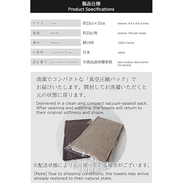サイズ:約25cm×25cm 重量:約25g/枚 デザイン(認定番号):ネイビー(第2021-1129号)、ホワイト(第2022-1032号)、ミックスグレー(第2021-918号)、ピンストライプグレー(第2021-917号)、リバーシブルネイビー(第2022-1326号)、ブルー・グリーン(第2022-1325号)、しましまネイビー・しましまグレー(第2022-2634号)、テールグリーン・ブラック(第2023-2689号)、無地Aアソート4枚(第2021-945号) 素材:綿100% 生産地:日本(愛媛県今治市) ※モニターの発色の具合により実際のものと色が異なる場合がございます。 ※清潔でコンパクトな圧縮パックでお届けいたします。開封してしばらくすると空気を含み、元の状態に戻ります。配送状態により元に戻っている場合がございます。