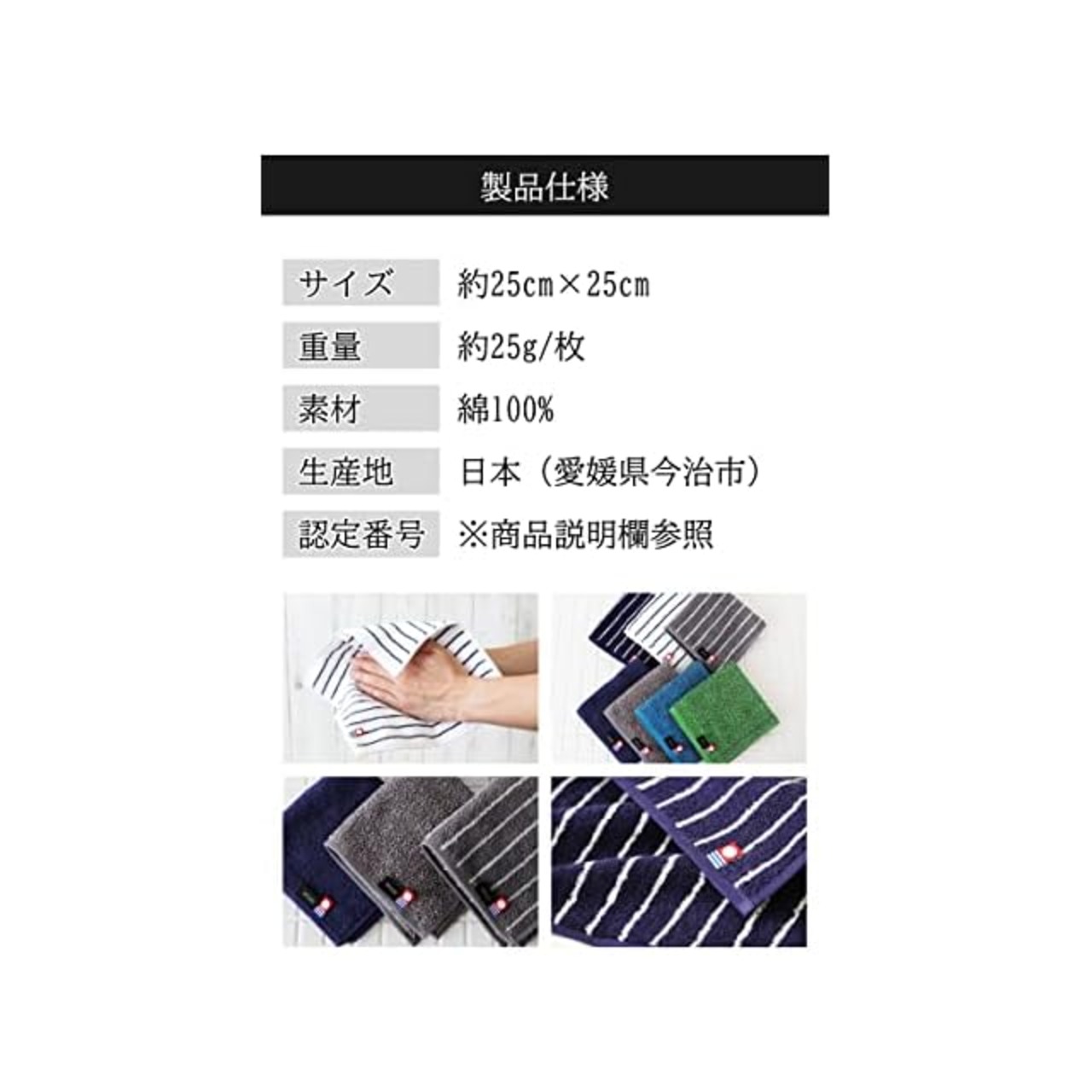 サイズ:約25cm×25cm 重量:約25g/枚 デザイン(認定番号):ネイビー(第2021-1129号)、ホワイト(第2022-1032号)、ミックスグレー(第2021-918号)、ピンストライプグレー(第2021-917号)、リバーシブルネイビー(第2022-1326号)、ブルー・グリーン(第2022-1325号)、しましまネイビー・しましまグレー(第2022-2634号)、テールグリーン・ブラック(第2023-2689号)、無地Aアソート4枚(第2021-945号) 素材:綿100% 生産地:日本(愛媛県今治市) ※モニターの発色の具合により実際のものと色が異なる場合がございます。 ※清潔でコンパクトな圧縮パックでお届けいたします。開封してしばらくすると空気を含み、元の状態に戻ります。配送状態により元に戻っている場合がございます。