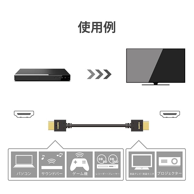 ケーブル直径約3.2mmで取り回しがしやすく、すっきり配線できる、スーパースリムタイプのイーサネット対応ハイスピードHDMIケーブルです。