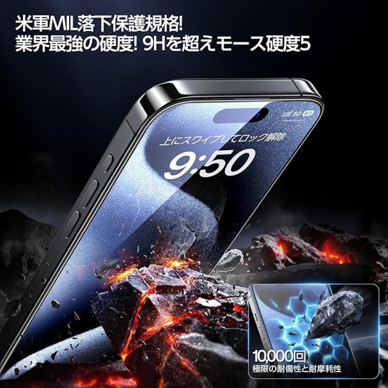 【業界最強の硬度水準・5倍以上の耐衝撃性】SGS米軍落下保護規格の認証を取得しました!※米軍「MIL-STD-810H」規格認証番号:GZHL2311040506SD|Nov 20,2023 二次強化硬度と7層の複合構造で、超高温Na+/k+イオン交換技術など、多くの画期的な加工技術を採用し、9Hの硬度を超えるモース硬度5を実現します。10,000回の極限耐摩耗性テストで、小刀や鍵などの鋭利な物品でも擦り傷が付かられないです!また、厚い発散防止緩衝層によって、衝撃吸収を最大化し、破片が落ちたり飛び散ったりしなくて、お客様のスマホの画面を本当に保護し、絶対的な安心感を提供いたします!