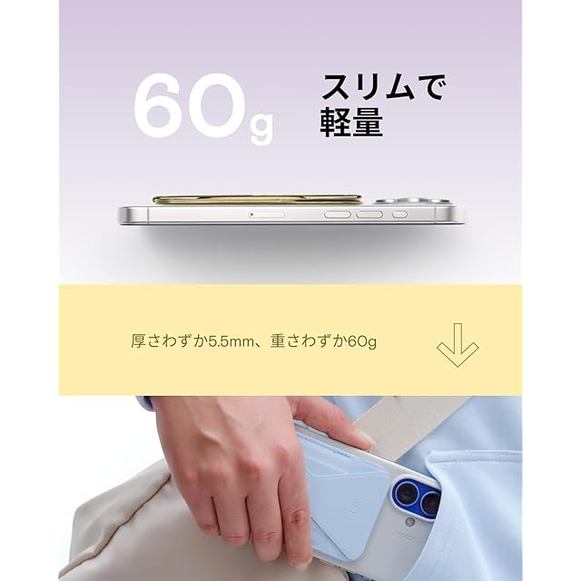 【カード1~2枚収納・身軽に外出】スリムなデザインでありながら、クレジットカードや運転免許証などをすっきり収納可能です。スタンドを展開してすぐに取り出せ、畳めるとカードのようにスマホに付け、場所をとりません。