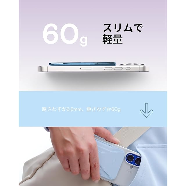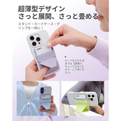 【カード1~2枚収納・身軽に外出】スリムなデザインでありながら、クレジットカードや運転免許証などをすっきり収納可能です。スタンドを展開してすぐに取り出せ、畳めるとカードのようにスマホに付け、場所をとりません。