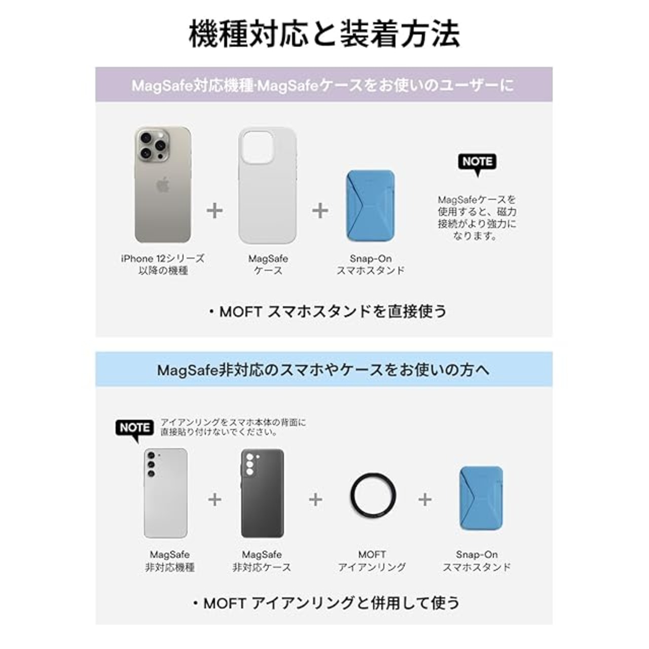 【アイアンリング付き・全機種対応】iPhone 17 Pro Max/iPhone 17 Pro/iPhone Air/iPhone 17/iPhone 16 Pro Max/iPhone 16 Pro/iPhone 16 Plus/iPhone 16/iPhone 15 Pro Max/iPhone 15 Pro/iPhone 15 Plus/iPhone 15/iPhone 14 Pro Max/ iPhone 14 Pro/iPhone 14 Plus/iPhone 14/iPhone 13 Pro Max/iPhone 13 Pro/iPhone 13/iPhone 13 Mini/iPhone 12 Pro Max/iPhone 12 Pro/iPhone 12/iPhone 12 Mini 全シリーズに対応できます。背面にマグネットが付いていないスマートフォンも、付属のアイアンリングをスマートフォンケースに取り付けるだけで使用できます。 取り付け方法については、詳細ページをご参照ください。【注意:粘着面がある側はスマホケースまたはスマホの背面に貼り付けてください。スタンドには貼り付けないでください。】