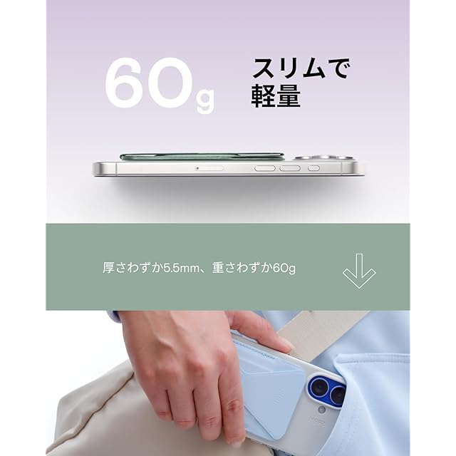 【カード1~2枚収納・身軽に外出】スリムなデザインでありながら、クレジットカードや運転免許証などをすっきり収納可能です。スタンドを展開してすぐに取り出せ、畳めるとカードのようにスマホに付け、場所をとりません。