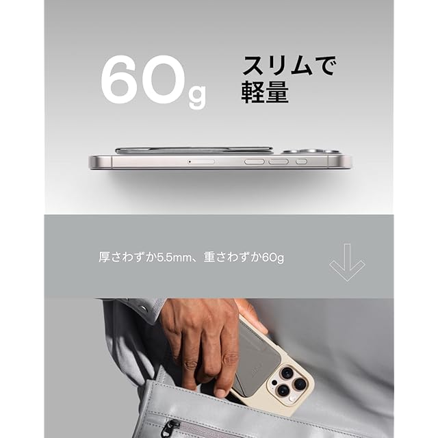 【カード1~2枚収納・身軽に外出】スリムなデザインでありながら、クレジットカードや運転免許証などをすっきり収納可能です。スタンドを展開してすぐに取り出せ、畳めるとカードのようにスマホに付け、場所をとりません。