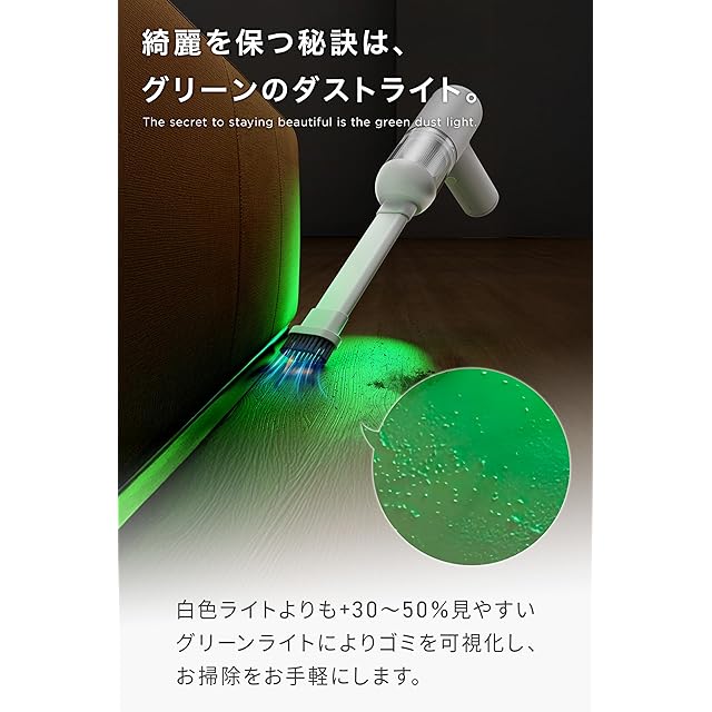 ✅【綺麗を保つ秘訣はグリーンダストライト!】 ダイソンでも採用されている、ゴミを可視化できるグリーンのダストライトを採用!! 暗所で見やすいのはもちろん、白色ライトより+30%〜50%ゴミが判別しやすくなるため、日々のお掃除が快適になり身の回りの清潔を保ちます