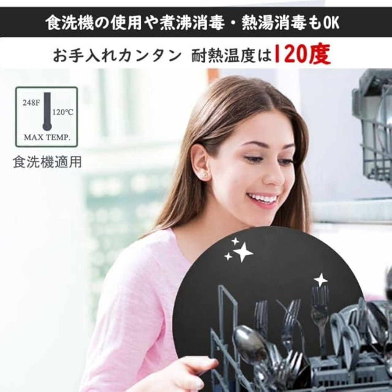 【抗菌 まな板・食洗機対応・雑音なし】耐熱温度は130度なので、食洗機の使用や煮沸消毒・熱湯消毒も行っていただけます。お手入れが簡単なので日々気を付けたい衛生面でも安心です。水弾きも良く、汚れもサッと拭き取れます。食材が色鮮やかに映えスタイリッシュなブラックで展開。