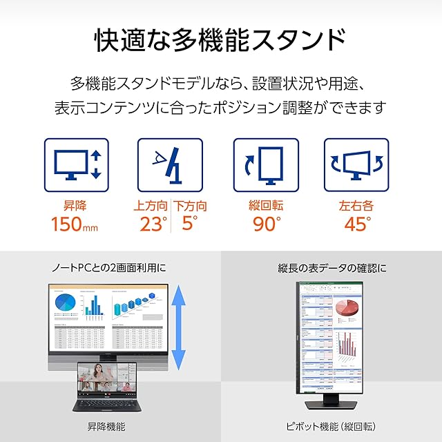 [スタンド]昇降幅:上下150mm、左右各(スウィーベル):45°、縦回転:90°、角度:上方向 23°/下方向 5°