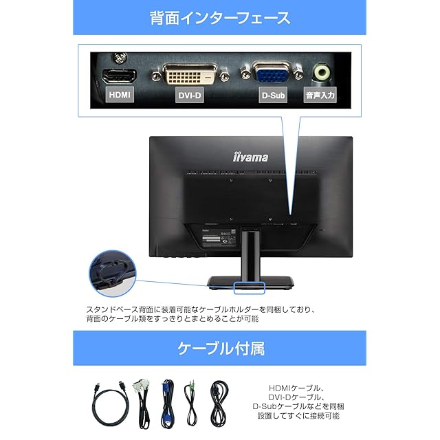 HDMI/DVI-D/D-Sub端子 ケーブルも標準同梱 ※日本国内で出荷される商品の付属品は、日本向け仕様となります。