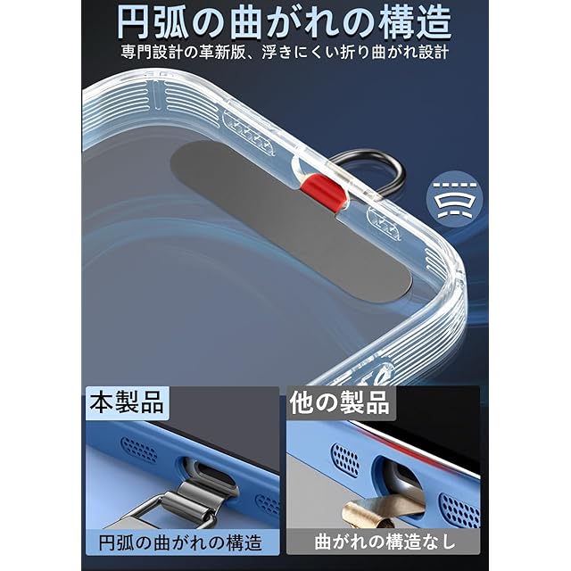 【製品特徴・傷防止フィルム加工】傷防止フィルム付き:スマートフォンに傷がつくのを防ぎます。多彩なデザインと色展開:お好みに合わせて選べます。高耐久性:高品質なステンレス素材を使用し、耐久性と頑丈さに優れています。曲がれる設計:浮き上がりを防ぐ工夫を施しました。極薄設計(0.4mm):スマホとケースの間に挟んでも違和感がなく、互換性の心配は不要です。
