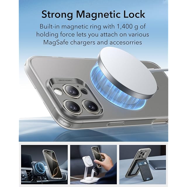 【より強力な磁気ロック】1,400gの保持力を持つ強力な磁気吸着リングは、MagSafeと互換性があり、より速く、より簡単な瞬間吸着ワイヤレス充電を実現させ、あらゆるMagSafeアクセサリーとの安全な磁気吸着ロックを可能にします。対応機種:いphone16pro ケース