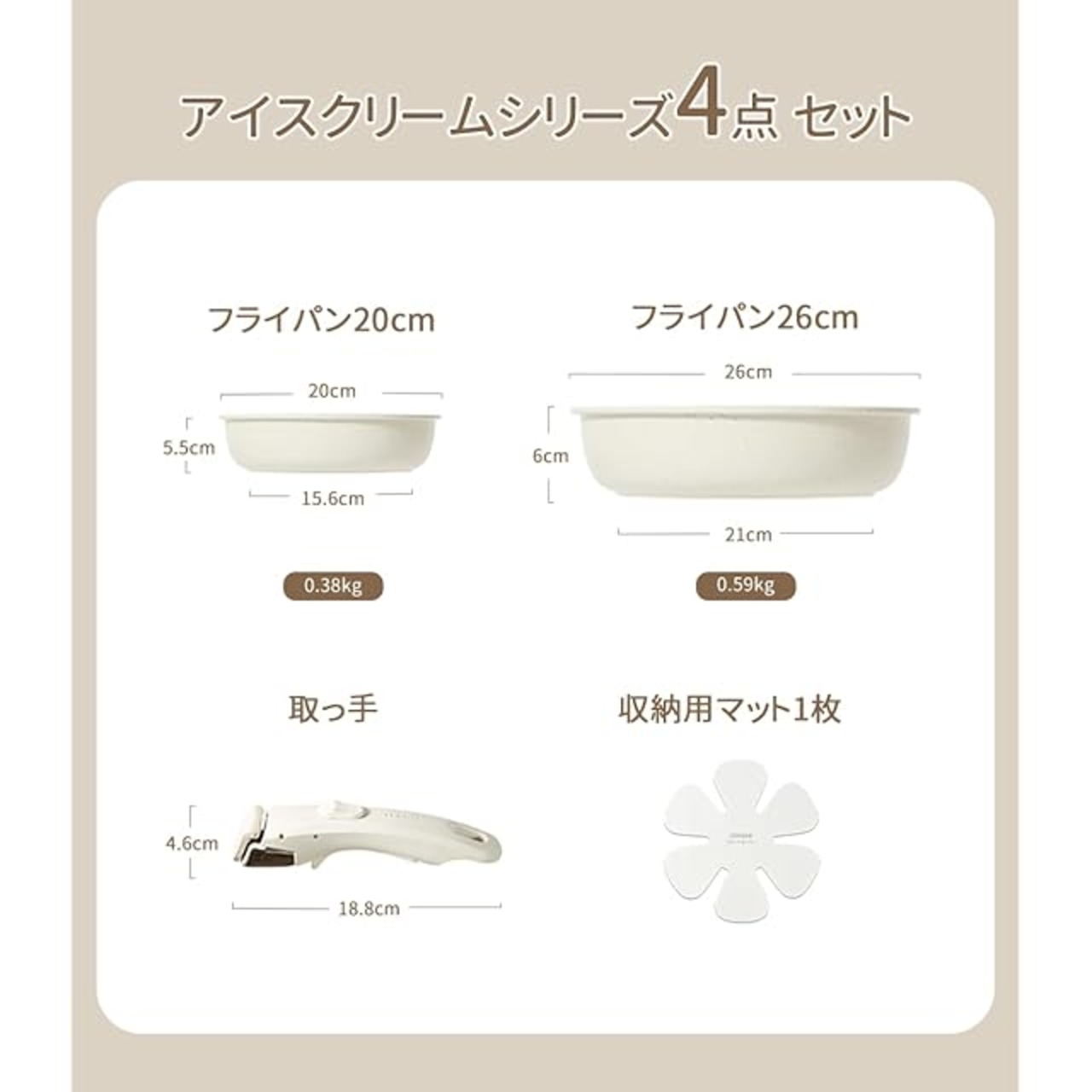 【セット内容・材質】フライパン20cm/0.38kg、26cm/0.59kg、専用取っ手×1本、収納用マット*1枚、梱包重量(約): 1.5kg;