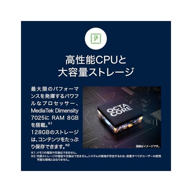 Android 14、MediaTek Dimensity 7025 (2.5GHz x 2+ 2.0GHz x 6)