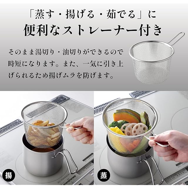 【ステンレス製】鍋本体、ストレーナーはステンレス製なので保存もでき、1~2日程度であれば鍋での保存もできます。丈夫で長持ちし、金属製のヘラやお玉も使えます。
