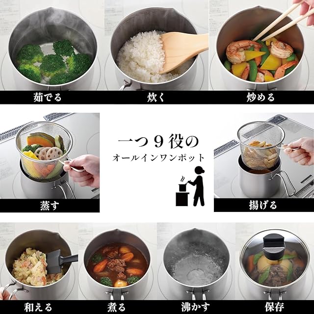 【ストレーナー付きで1台9役】「揚げる・蒸す・茹でる・煮る・沸かす・炒める・炊く・和える・保存する」一つで9つの使い方ができる、ストレーナー付きステンレス製マルチポット