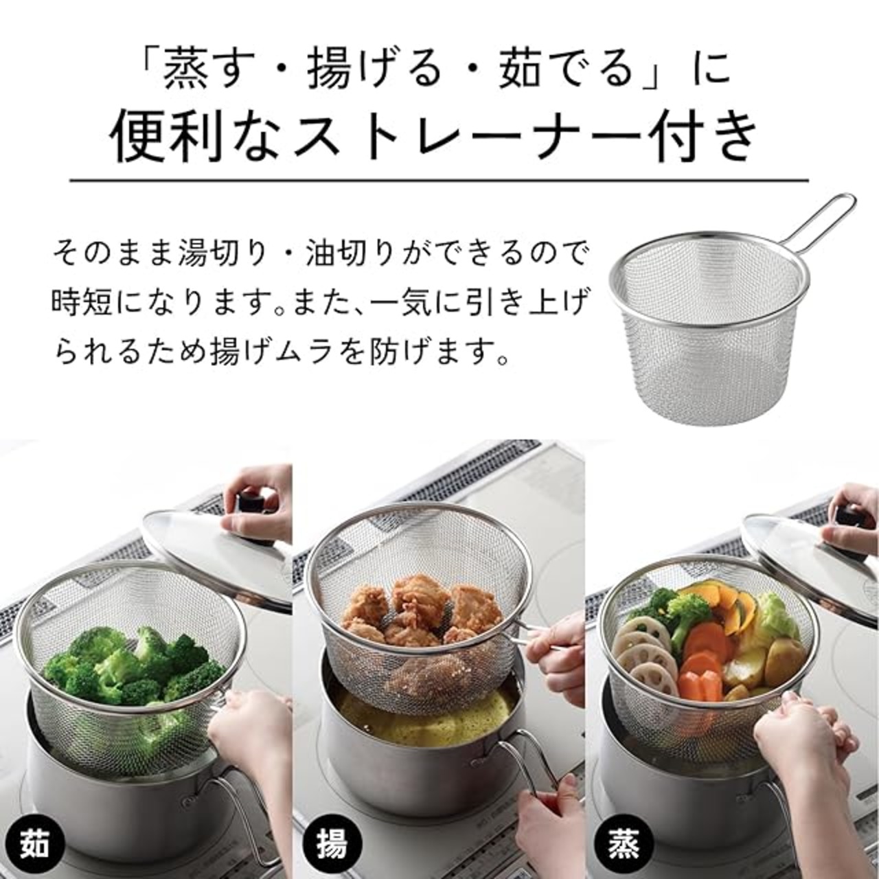 【ストレーナー付きで1台9役!】「①揚げる②蒸す③茹でる④煮る⑤沸かす⑥炒める⑦炊く⑧和える⑨保存する」一つで9つの使い方ができる、ストレーナー付きステンレス製マルチポットです。ストレーナーが付いたことで、蒸し料理もできるようになりました。また、から揚げやフライドポテトなどを一気に引き上げられ、時間差による揚げムラを防ぎます。野菜などを洗ったりザルとして使っても便利です。鍋本体は日本製で、金属加工の産地、新潟県燕三条製です。