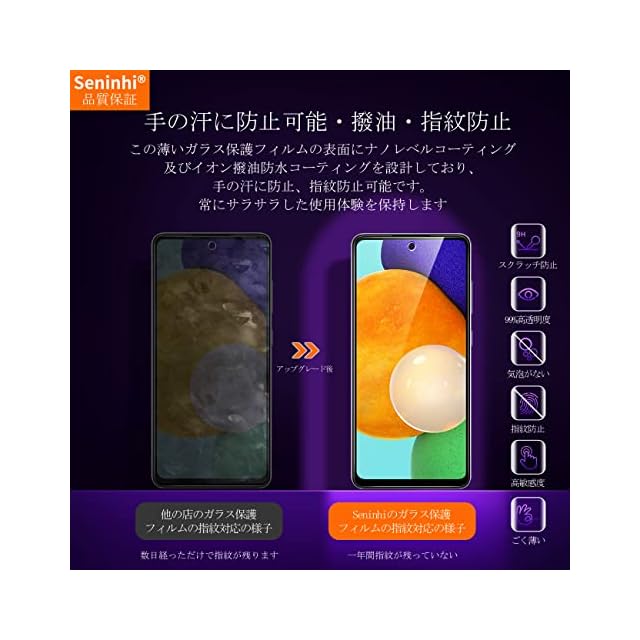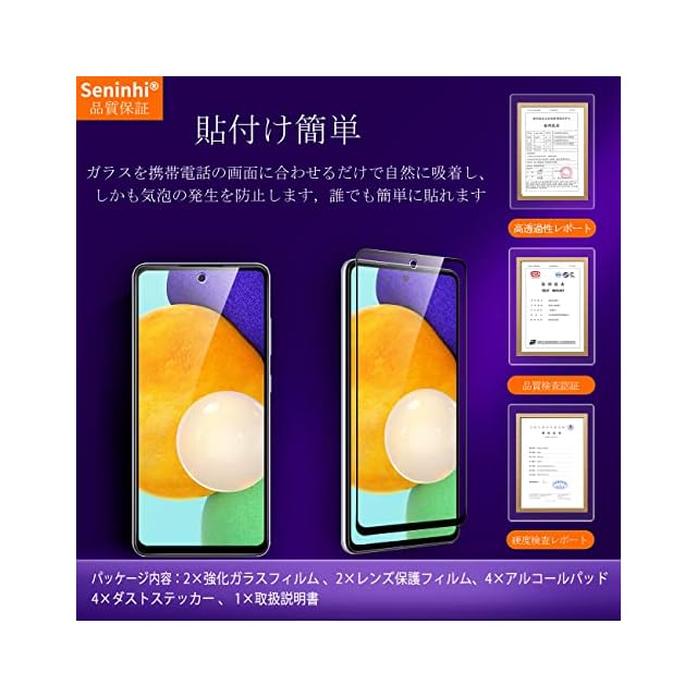 ☞【専用設計】Galaxy A52 5G SC-53B 専用に設計した保護フィルムなので、必ずご購入前にお使いの携帯電話の機種をご確認ください。(お買い得な4点セット)液晶保護フィルム*2枚+レンズ保護フィルム*2枚の組み合わせ、1度のご購入で、携帯電話の保護フィルムとカメラ保護フィルムが入っております。【正規品】Seninhi ブランドは 10 年間携帯電話保護フィルムの製造しており、最高品質の保護フィルムを生産することを約束します。市販の高価な保護フィルムと同じですが、価格がもっと安いので、お客様に大変ご愛顧いただき、月間販売数は20,000枚を超えました。弊社の製品は購入価値があります。安心して当社の製品をお買い求めください。