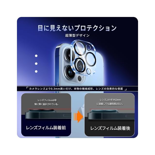 <b>【Seninhi】iPhone 13 Pro / iPhone 13 Pro Max レンズ保護フィルム について </b><br><br>仕様<br> 厚さ: 0.26mm <br>光透過率: 99% <br>素材:国産AGC旭硝子ガラス <br>対応機種:iPhone 12 Pro Max <br><br> <br>【同梱品】</b><br>3 × レンズ保護フィルム <br> 3 × スクリーンクリーニングキット <br> 3 × ホコリ除去用ステッカー <br> <br> <b>特徴 </b> <br> <b>【9h高硬度】</b><br> 私たちの強化フィルムは日本AGC旭硝子ガラスを使用し、4.5時間の高温急冷と多重強化処理して、同じ厚さの通常のレンズガラスフィルムに比べて約5倍の強さを持ち、ガラスフィルムは9Hの最も硬い表面硬度に達しました。ナイフなどの鋭いものでも傷を与えません。日常生活で気軽に対応できます。 <br> <b>【飛散防止】</b><br> 飛散防止を通して、万が一ガラスが割れても破片が飛散しなく、破片による重傷事故を減らして、とても安全です。 <br> <b> 【ラウンドエッジ加工】</b><br>真空メッキプロセスを使用し、正しい丸みをエッジ処理して、不快感がありません。しかもエッジ部分へ衝撃が少なく、快適で滑らかな肌触りを提供する同時に、使用中に鋭い角のエッジで指を傷されません。 <br> <b>【99%以上の携帯電話ケースに干渉しない】</b><br> 百件以上な携帯電話ケースをテストしましたが、適応率は 99%に達しました。 <br> <b>【素人でも簡単に貼り付け】</b><br>iPhone 13 Pro / iPhone 13 Pro Max レンズ保護フィルムの粘着面は自動吸着できるので、ガラスフィルムを携帯電話のレンズに合わせるだけで自然に吸着し、しかも気泡の発生しません。誰でも簡単に貼り付けられ、万が一失敗しても剥がして貼り直すことができます。 <br> <b> 三、ご注意事項:</b><br> 1.フィルムを貼り付ける前に、手をきれいに洗ってください。<br> 2.貼り直しによる泡を防止するため、はがす際にフィルムの粘着面に手や物が触れないようご注意ください。<br> 3. 保護フィルムは過度の衝撃等を防止するものではありません。携帯電話の故障、紛失等の責任は負いかねます。<br> <b> 四、アフターサービス ご購入日より180日以内に初期不良や、ヒビ・欠け・ホコリ混入・サイズ違い等の使用上の問題がございましたら、ご遠慮なく、いつでもお気軽にご連絡ください。私たちは具体的な問題により、お客様に満足できる解決策を提供します。</b>