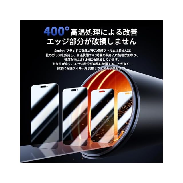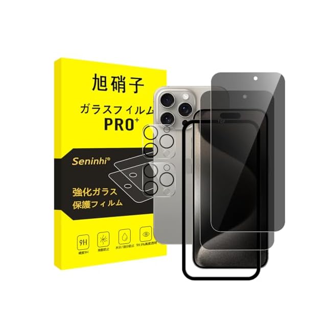 <b>【Seninhi】 iPhone 15 pro max プライバシーフィルム</b><br> <br><br>について 仕様</b><br> <br>厚さ: 0.26mm <br>素材:国産AGC旭硝子ガラス <br>対応機種:iPhone 15 pro max<br>【同梱品】 <br>2 × 強化ガラスフィルム (覗き見防止 )<br> 2 × 強化レンズフィルム <br> 1 × ガイド枠<br> 1 × 取扱説明書 <br>2 × スクリーンクリーニングキット <br><b>特徴</b> <br>【9h高硬度】 私たちの強化フィルムは国産AGC旭硝子ガラスを使用し、4.5時間の高温急冷と多重強化処理して、同じ厚さの通常のガラスフィルムに比べて約5倍の強さを持ち、ガラスフィルムは9Hの最も硬い表面硬度に達しました。ナイフなどの鋭いものでも傷を与えません。日常生活で気軽に対応できます。<br> 【飛散防止】 飛散防止を通して、万が一ガラスが割れても破片が飛散しなく、破片による重傷事故を減らして、とても安全です。<br> 【覗き見防止 】 特別なブラインド加工により、真正面から見ると高透過率ではっきり見えますが、画面を横から覗かれることを防ぐ180度ブラインド仕様 <br>【高感度タッチ】 この強化フィルムは0.26mmのゴールデン厚さを設計しており、防爆する同時に、感度が高いタッチ体験と連続タッチを確保し、高感度でスムーズなオンスクリーン操作を実現し、ガラスフィルムを取り付けない画面とほぼ同じような使用体験を与えます。高感度でスムーズなオンスクリーン操作は様々なゲーム アプリケーションに適用します。<br> 【99%以上の携帯電話ケースに干渉しない】 百件以上な携帯電話ケースをテストしましたが、適応率は 99%に達しました。高品質の接着剤を使用したので、携帯電話ケースに取り付けられている瞬間保護フィルムがわずかに浮き、軽く押すと気泡がきれいに消えます。<br> 【素人でも簡単に貼り付け】 ガラスフィルムの取扱説明書に張り付ける方法は詳しく記載したので、位置をよく合わせた後、上から軽く貼り付けると、シリコン吸着層が自動的に吸着し、気泡が発生しません。誰でも簡単に貼り付けられ、万が一失敗しても剥がして貼り直すことができます。<br><br><b> 三、ご注意事項:</b><br> 1.フィルムを貼り付ける前に、手をきれいに洗ってください。<br> 2.泡があれば、クロスを指に巻きつけて少しずつ絞りだしてください。<br> 3.貼り直しによる泡を防止するため、はがす際にフィルムの粘着面に手や物が触れないようご注意ください。<br> 4. 保護フィルムは過度の衝撃等を防止するものではありません。携帯電話の故障、紛失等の責任は負いかねます。<br><br><b> 四、アフターサービス ご購入日より180日以内に初期不良や、ヒビ・欠け・ホコリ混入・サイズ違い等の使用上の問題がございましたら、ご遠慮なく、いつでもお気軽にご連絡ください。私たちは具体的な問題により、お客様に満足できる解決策を提供します。</b>