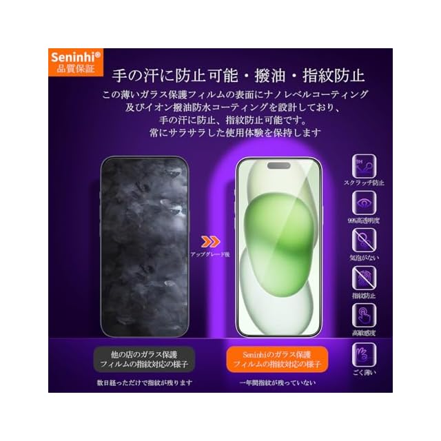 <b>【Seninhi】</b><br> iPhone 15 plus 強化ガラス 保護フィルム<br> <b> 仕様</b><br> 厚さ: 0.26mm <br>光透過率: 99% <br>素材:国産AGC旭硝子ガラス <br>対応機種:iphone 15 plus <br><b>【同梱品】</b><br> 2 × 強化ガラスフィルム <br>2 × レンズ保護フィルム <br>1 × 取扱説明書 <br>1 × ガイド枠 <br>2 × スクリーンクリーニングキット <br>2 × ホコリ除去用ステッカー 特徴 <br><br><b>【9h高硬度】</b><br> 私たちの強化フィルムは 国産AGC旭硝子ガラスを使用し、4.5時間の高温急冷と多重強化処理して、同じ厚さの通常のガラスフィルムに比べて約5倍の強さを持ち、ガラスフィルムは9Hの最も硬い表面硬度に達しました。ナイフなどの鋭いものでも傷を与えません。日常生活で気軽に対応できます。<br><br><b> 【飛散防止】</b><br> 飛散防止を通して、万が一ガラスが割れても破片が飛散しなく、破片による重傷事故を減らして、とても安全です。 <br><br><b>【高感度タッチ】</b><br> この強化フィルムは0.26mmのゴールデン厚さを設計しており、防爆する同時に、感度が高いタッチ体験と連続タッチを確保し、高感度でスムーズなオンスクリーン操作を実現し、ガラスフィルムを取り付けない画面とほぼ同じような使用体験を与えます。高感度でスムーズなオンスクリーン操作は様々なゲーム アプリケーションに適用します。<br><br><b> 【99%以上の携帯電話ケースに干渉しない】</b><br> 百件以上な携帯電話ケースをテストしましたが、適応率は 99%に達しました。高品質の接着剤を使用したので、携帯電話ケースに取り付けられている瞬間保護フィルムがわずかに浮き、軽く押すと気泡がきれいに消えます。<br><br><b> 【素人でも簡単に貼り付け】</b><br> ガラスフィルムの取扱説明書に張り付ける方法は詳しく記載したので、位置をよく合わせた後、上から軽く貼り付けると、シリコン吸着層が自動的に吸着し、気泡が発生しません。誰でも簡単に貼り付けられ、万が一失敗しても剥がして貼り直すことができます。<br><br><b> 三、ご注意事項:</b><br> 1.フィルムを貼り付ける前に、手をきれいに洗ってください。<br> 2.泡があれば、クロスを指に巻きつけて少しずつ絞りだしてください。 <br>3.貼り直しによる泡を防止するため、はがす際にフィルムの粘着面に手や物が触れないようご注意ください。<br> 4. 保護フィルムは過度の衝撃等を防止するものではありません。携帯電話の故障、紛失等の責任は負いかねます。 <br><br>四、アフターサービス ご購入日より180日以内に初期不良や、ヒビ・欠け・ホコリ混入・サイズ違い等の使用上の問題がございましたら、ご遠慮なく、いつでもお気軽にご連絡ください。私たちは具体的な問題により、お客様に満足できる解決策を提供します。
