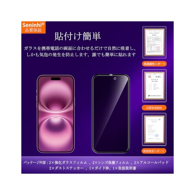 ☞【専用設計】 iPhone 16 専用に設計した保護フィルムなので、必ずご購入前にお使いの携帯電話の年間携帯電話保護フィルムの製造しており機種をご確認ください。(お得な4点セット) 液晶保護フィルム *2枚 + レンズ保護フィルム *2枚【正規品】Seninhi ブランドは 10 年間携帯電話保護フィルムの製造しており 、最高品質の保護フィルムを生産することを約束します。市販の高価な保護フィルムと同じですが、価格がもっと安いので、お客様に大変ご愛顧いただき、月間販売数は20,000枚を超えました。弊社の製品は購入価値があります。安心して当社の製品をお買い求めください。