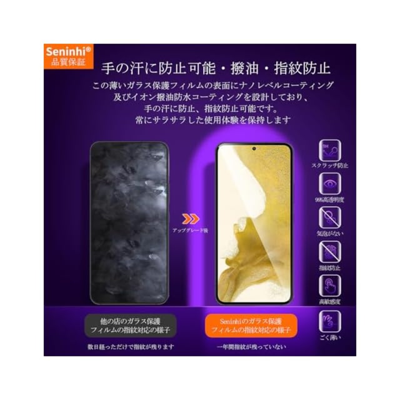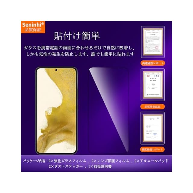 <b>【Seninhi】</b><br> Galaxy S22 SCG13 SC51C 強化ガラス 保護フィルム<br> <b> 仕様</b><br> 厚さ: 0.26mm <br>光透過率: 99% <br>素材:国産AGC旭硝子ガラス <br>対応機種:Galaxy S22 SCG13 SC51C <br><b>【同梱品】</b><br> 2 × 強化ガラスフィルム <br>2 × レンズ保護フィルム 【2組(6枚)】<br>1 × 取扱説明書 <br>2 × スクリーンクリーニングキット <br>2 × ホコリ除去用ステッカー 特徴 <br><br><b>【9h高硬度】</b><br> 私たちの強化フィルムは 国産AGC旭硝子ガラスを使用し、4.5時間の高温急冷と多重強化処理して、同じ厚さの通常のガラスフィルムに比べて約5倍の強さを持ち、ガラスフィルムは9Hの最も硬い表面硬度に達しました。ナイフなどの鋭いものでも傷を与えません。日常生活で気軽に対応できます。<br><br><b> 【飛散防止】</b><br> 飛散防止を通して、万が一ガラスが割れても破片が飛散しなく、破片による重傷事故を減らして、とても安全です。 <br><br><b>【高感度タッチ】</b><br> この強化フィルムは0.26mmのゴールデン厚さを設計しており、防爆する同時に、感度が高いタッチ体験と連続タッチを確保し、高感度でスムーズなオンスクリーン操作を実現し、ガラスフィルムを取り付けない画面とほぼ同じような使用体験を与えます。高感度でスムーズなオンスクリーン操作は様々なゲーム アプリケーションに適用します。<br><br><b> 【99%以上の携帯電話ケースに干渉しない】</b><br> 百件以上な携帯電話ケースをテストしましたが、適応率は 99%に達しました。高品質の接着剤を使用したので、携帯電話ケースに取り付けられている瞬間保護フィルムがわずかに浮き、軽く押すと気泡がきれいに消えます。<br><br><b> 【素人でも簡単に貼り付け】</b><br> ガラスフィルムの取扱説明書に張り付ける方法は詳しく記載したので、位置をよく合わせた後、上から軽く貼り付けると、シリコン吸着層が自動的に吸着し、気泡が発生しません。誰でも簡単に貼り付けられ、万が一失敗しても剥がして貼り直すことができます。<br><br><b> 三、ご注意事項:</b><br> 1.フィルムを貼り付ける前に、手をきれいに洗ってください。<br> 2.泡があれば、クロスを指に巻きつけて少しずつ絞りだしてください。 <br>3.貼り直しによる泡を防止するため、はがす際にフィルムの粘着面に手や物が触れないようご注意ください。<br> 4. 保護フィルムは過度の衝撃等を防止するものではありません。携帯電話の故障、紛失等の責任は負いかねます。 <br><br>四、アフターサービス ご購入日より180日以内に初期不良や、ヒビ・欠け・ホコリ混入・サイズ違い等の使用上の問題がございましたら、ご遠慮なく、いつでもお気軽にご連絡ください。私たちは具体的な問題により、お客様に満足できる解決策を提供します。