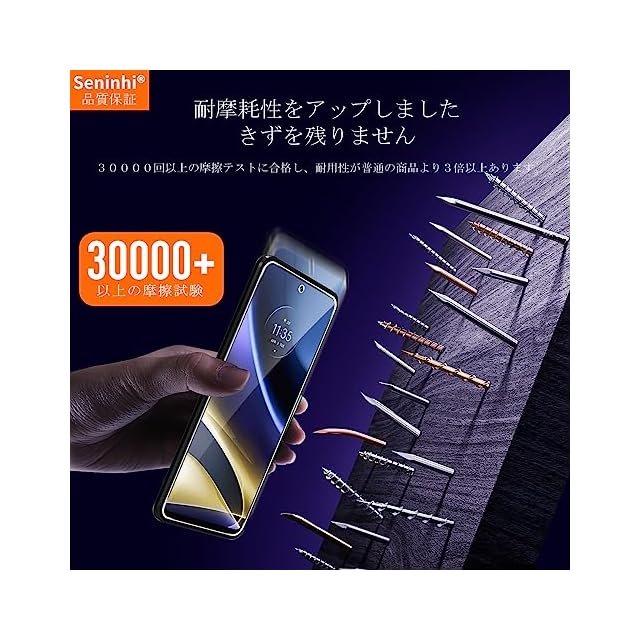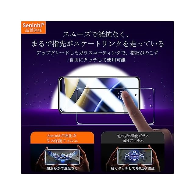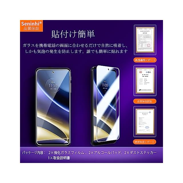 【Seninhi】MOTO G52J 5G 強化ガラス 保護フィルム について 仕様 厚さ: 0.26mm 光透過率: 99% 素材:日本AGC旭硝子ガラス 対応機種: MOTO G52J 5G【同梱品】 2 × 強化ガラスフィルム 1 × 取扱説明書 4 × スクリーンクリーニングキット 2 × ホコリ除去用ステッカー 特徴 【9h高硬度】 私たちの強化フィルムは国産AGC旭硝子ガラスを使用し、4.5時間の高温急冷と多重強化処理して、同じ厚さの通常のガラスフィルムに比べて約5倍の強さを持ち、ガラスフィルムは9Hの最も硬い表面硬度に達しました。ナイフなどの鋭いものでも傷を与えません。日常生活で気軽に対応できます。 【飛散防止】 飛散防止を通して、万が一ガラスが割れても破片が飛散しなく、破片による重傷事故を減らして、とても安全です。 【高感度タッチ】 この強化フィルムは0.26mmのゴールデン厚さを設計しており、防爆する同時に、感度が高いタッチ体験と連続タッチを確保し、高感度でスムーズなオンスクリーン操作を実現し、ガラスフィルムを取り付けない画面とほぼ同じような使用体験を与えます。高感度でスムーズなオンスクリーン操作は様々なゲーム アプリケーションに適用します。 【99%以上の携帯電話ケースに干渉しない】 百件以上な携帯電話ケースをテストしましたが、適応率は 99%に達しました。高品質の接着剤を使用したので、携帯電話ケースに取り付けられている瞬間保護フィルムがわずかに浮き、軽く押すと気泡がきれいに消えます。 【素人でも簡単に貼り付け】 ガラスフィルムの取扱説明書に張り付ける方法は詳しく記載したので、位置をよく合わせた後、上から軽く貼り付けると、シリコン吸着層が自動的に吸着し、気泡が発生しません。誰でも簡単に貼り付けられ、万が一失敗しても剥がして貼り直すことができます。 三、ご注意事項: 1.フィルムを貼り付ける前に、手をきれいに洗ってください。 2.泡があれば、クロスを指に巻きつけて少しずつ絞りだしてください。 3.貼り直しによる泡を防止するため、はがす際にフィルムの粘着面に手や物が触れないようご注意ください。 4. 保護フィルムは過度の衝撃等を防止するものではありません。携帯電話の故障、紛失等の責任は負いかねます。 四、アフターサービス ご購入日より180日以内に初期不良や、ヒビ・欠け・ホコリ混入・サイズ違い等の使用上の問題がございましたら、ご遠慮なく、いつでもお気軽にご連絡ください。私たちは具体的な問題により、お客様に満足できる解決策を提供します。 【ご注意】商品はガラス製のため、貼り付け後の落下による破損は外となります。
