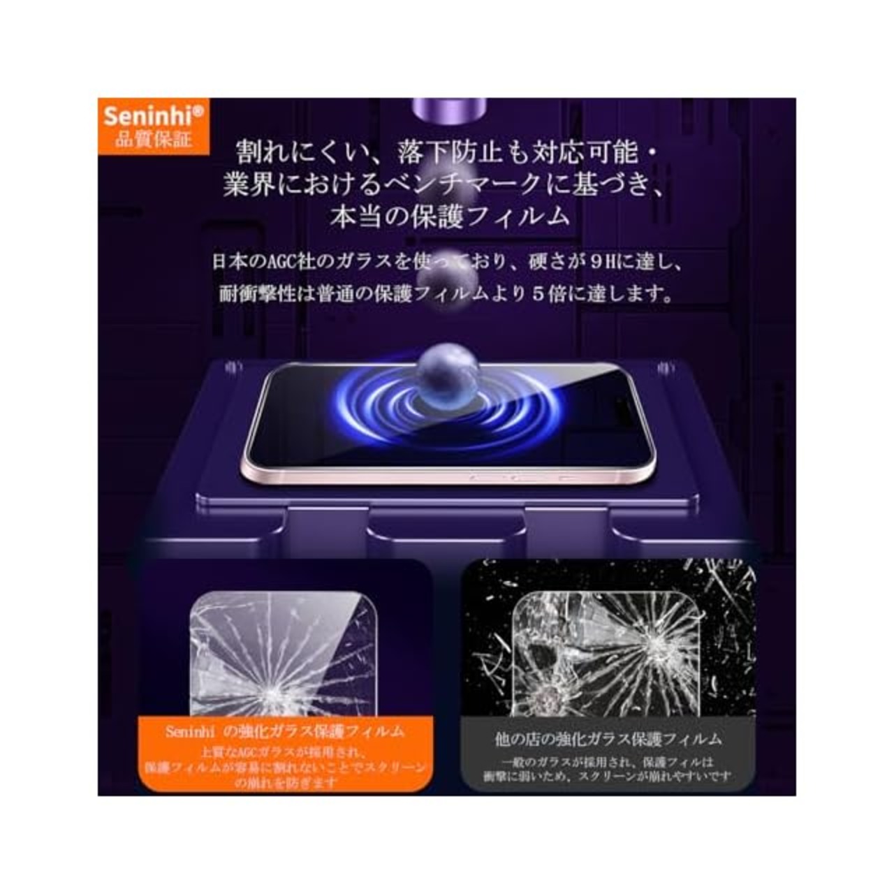 <b>【Seninhi】</b><br> iPhone 15 強化ガラス 保護フィルム<br> <b> 仕様</b><br> 厚さ: 0.26mm <br>光透過率: 99% <br>素材:国産AGC旭硝子ガラス <br>対応機種:iphone 15 <br><b>【同梱品】</b><br> 2 × 強化ガラスフィルム <br>2 × レンズ保護フィルム <br>1 × 取扱説明書 <br>1 × ガイド枠 <br>2 × スクリーンクリーニングキット <br>2 × ホコリ除去用ステッカー 特徴 <br><br><b>【9h高硬度】</b><br> 私たちの強化フィルムは国産AGC旭硝子ガラスを使用し、4.5時間の高温急冷と多重強化処理して、同じ厚さの通常のガラスフィルムに比べて約5倍の強さを持ち、ガラスフィルムは9Hの最も硬い表面硬度に達しました。ナイフなどの鋭いものでも傷を与えません。日常生活で気軽に対応できます。<br><br><b> 【飛散防止】</b><br> 飛散防止を通して、万が一ガラスが割れても破片が飛散しなく、破片による重傷事故を減らして、とても安全です。 <br><br><b>【高感度タッチ】</b><br> この強化フィルムは0.26mmのゴールデン厚さを設計しており、防爆する同時に、感度が高いタッチ体験と連続タッチを確保し、高感度でスムーズなオンスクリーン操作を実現し、ガラスフィルムを取り付けない画面とほぼ同じような使用体験を与えます。高感度でスムーズなオンスクリーン操作は様々なゲーム アプリケーションに適用します。<br><br><b> 【99%以上の携帯電話ケースに干渉しない】</b><br> 百件以上な携帯電話ケースをテストしましたが、適応率は 99%に達しました。高品質の接着剤を使用したので、携帯電話ケースに取り付けられている瞬間保護フィルムがわずかに浮き、軽く押すと気泡がきれいに消えます。<br><br><b> 【素人でも簡単に貼り付け】</b><br> ガラスフィルムの取扱説明書に張り付ける方法は詳しく記載したので、位置をよく合わせた後、上から軽く貼り付けると、シリコン吸着層が自動的に吸着し、気泡が発生しません。誰でも簡単に貼り付けられ、万が一失敗しても剥がして貼り直すことができます。<br><br><b> 三、ご注意事項:</b><br> 1.フィルムを貼り付ける前に、手をきれいに洗ってください。<br> 2.泡があれば、クロスを指に巻きつけて少しずつ絞りだしてください。 <br>3.貼り直しによる泡を防止するため、はがす際にフィルムの粘着面に手や物が触れないようご注意ください。<br> 4. 保護フィルムは過度の衝撃等を防止するものではありません。携帯電話の故障、紛失等の責任は負いかねます。 <br><br>四、アフターサービス ご購入日より180日以内に初期不良や、ヒビ・欠け・ホコリ混入・サイズ違い等の使用上の問題がございましたら、ご遠慮なく、いつでもお気軽にご連絡ください。私たちは具体的な問題により、お客様に満足できる解決策を提供します。
